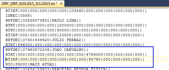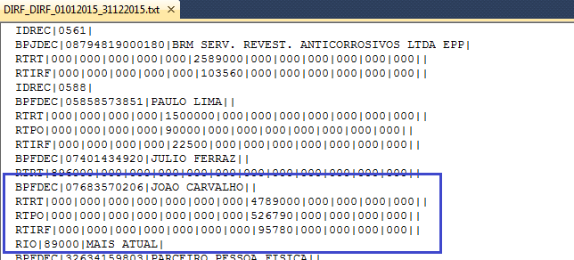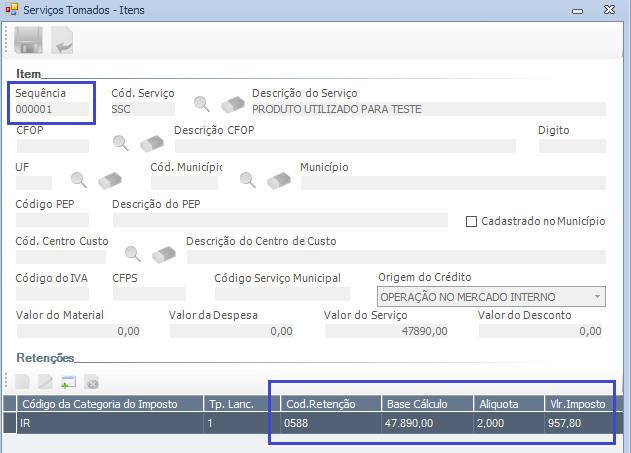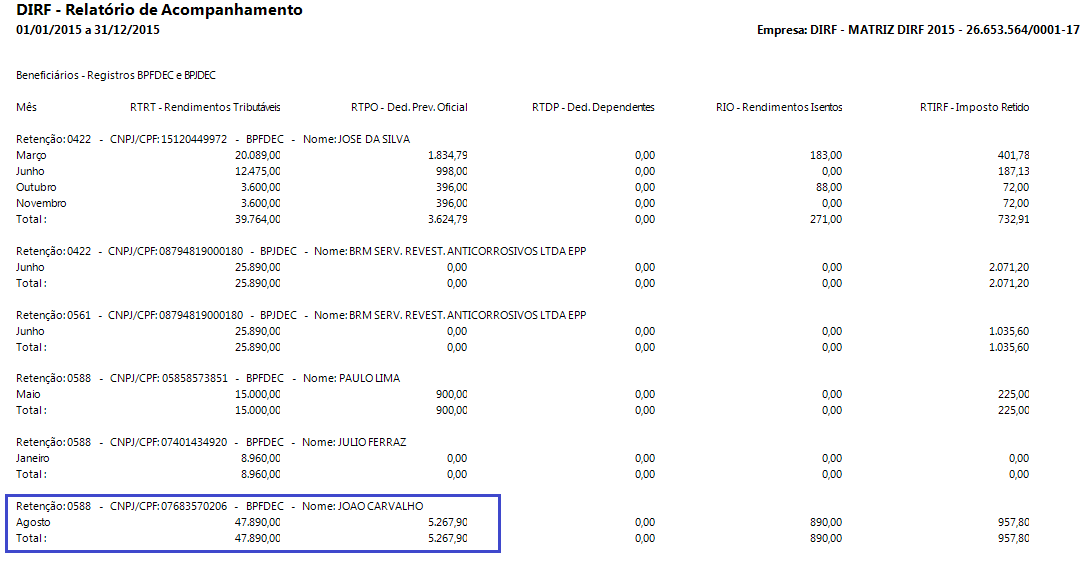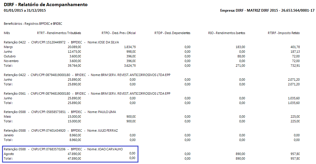 No exemplo abaixo o documento do beneficiário João Carvalho tem dois Itens e cada um deles tem uma retenção associada.