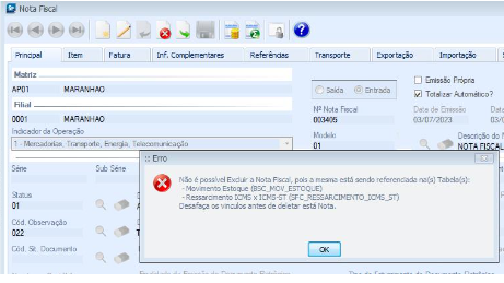 Ao realizar a solicitação de exclusão e se houver vínculo com as tabelas listadas, será apresentada a seguinte mensagem:: "Não é possível Excluir a Nota Fiscal, pois a mesma está sendo referenciada na(s) Tabela(s):". Na mensagem serão apresentadas também seguido das tabelas em que foram encontrados vínculos, a mensagem descrevendo o que deve ser feito para realizar a exclusão: