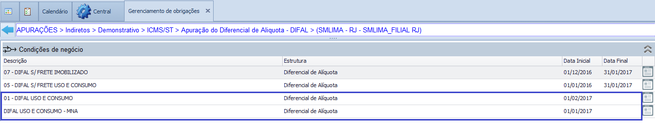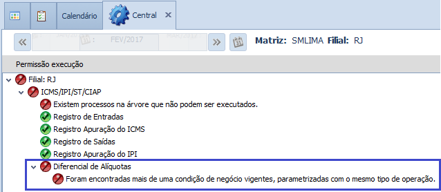 Foi feito tratamento no processo de apoio Diferencial de Alíquotas, eventual e oficial, para apresentar mensagem de erro quando identificadas duas ou mais condições de negócio para esta obrigação, e com o mesmo tipo de operação.