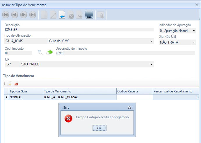 Descrição da Nota: Tratamento no campo Cod. Receita na tela Associar Tipo de Vencimento, torna-se obrigatório para Impostos Indiretos.