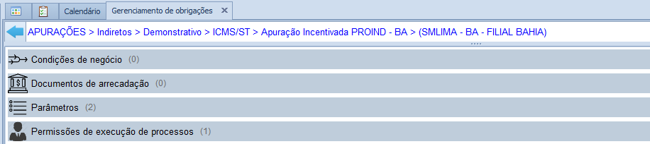 Foram criados os seguintes parâmetros para a geração do cálculo do incentivo PROIND BA: