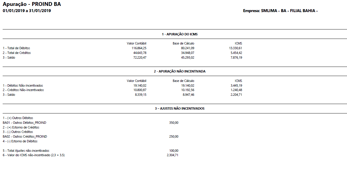 A apuração do incentivo PROIND/BA se dará a partir da Apuração do ICMS – MOD9, a partir do qual serão aplicadas as parametrizações necessárias e considerando as seguintes regras: