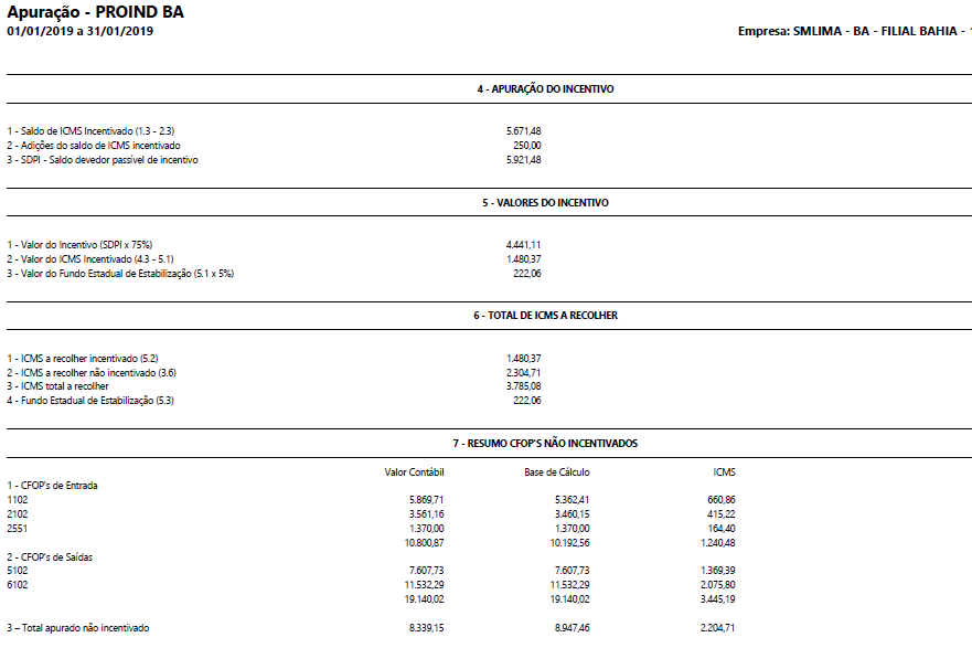 Foi desenvolvido relatório demonstrativo da Apuração Incentivada PROIND/BA.
