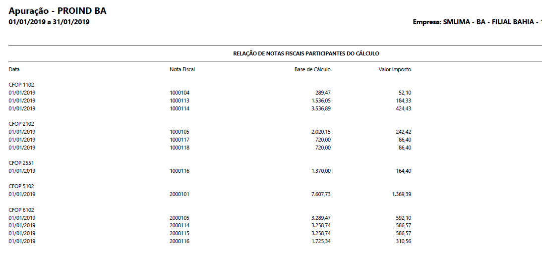 Ao final do relatório, será exibida uma relação analítica com as notas que fizeram parte do cálculo, de acordo com a parametrização da condição de negócio PROIND_BA_OPER_NAO_INCENTIVADA.