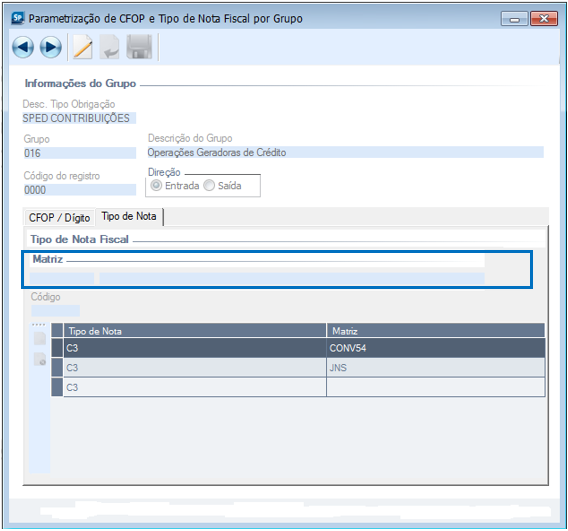 Tratamento na tela Parametrização de CFOP por Grupo para inclusão da opção de parametrização por Matriz na aba Tipo de Nota.