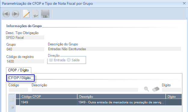 Para seu devido funcionamento, foi disponibilizado o grupo “040 - Entradas não Escrituradas” nas telas “Parametrização de CFOP por Grupo” e “Parametrização de Produto por Grupo” para que sejam cadastrados respectivamente o CFOP/ Dígito e o Produto que se enquadram nesta situação.