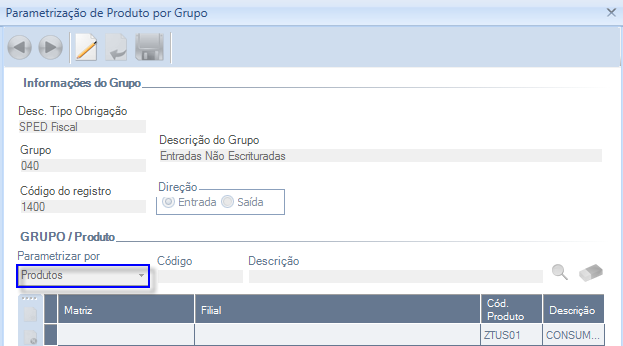 Desta forma, para gerar o registro 1400 para esta situação, devem ser consideradas as Notas Fiscais de Saídas, cujo CFOP/ Dígito e Produto estejam cadastrados no Grupo 040 das telas “Parametrização de CFOP por Grupo” e “Parametrização de Produto por Grupo”.