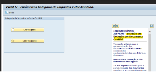 O Texto do Help da transação /PWSATI/ZLFM008 – Exclusão por Categoria de imposto X Prefixo Doc. Contábil estava errado, ou seja, continha informações errôneas: era informado que a transação permitia a inclusão como parametrização. Entretanto, o objetivo nessa transação é ser parametrizado o prefixo do documento contábil a ser “desconsiderado” pelos Extratores de Serviço Tomado /PWSATI/ZLFR012 e /PWSATI/ZLFR312.