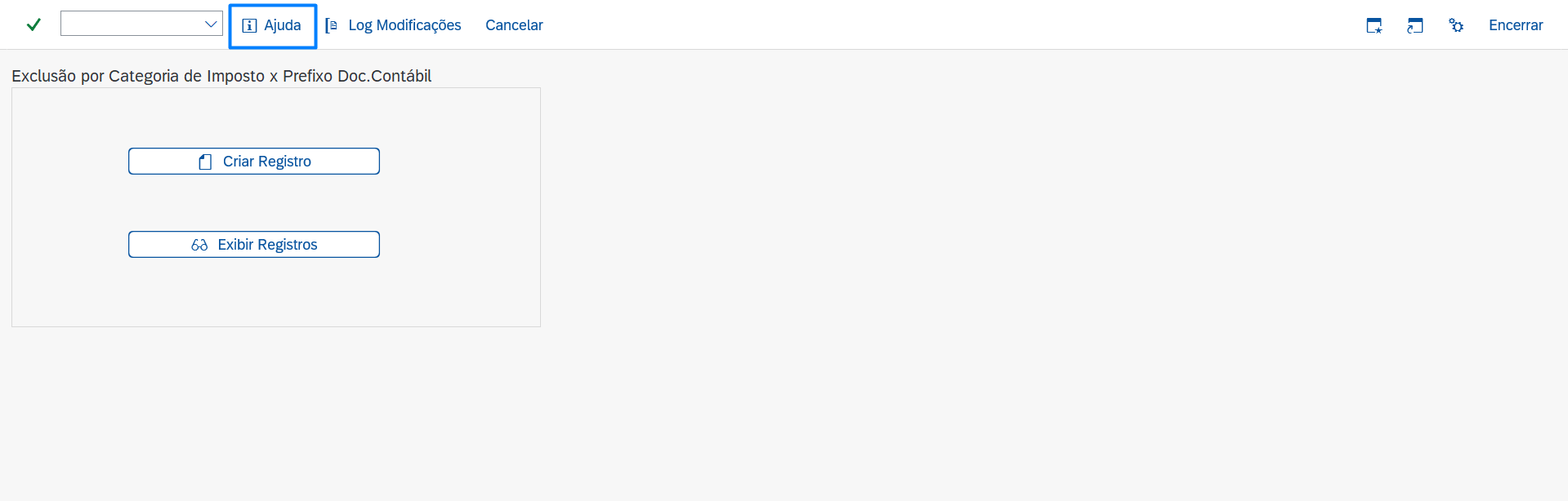 Ao executar a transação, escolha entre as opções Criar Registros: para parametrizar as informações ou Exibir Registros: para exibir as informações já parametrizadas.