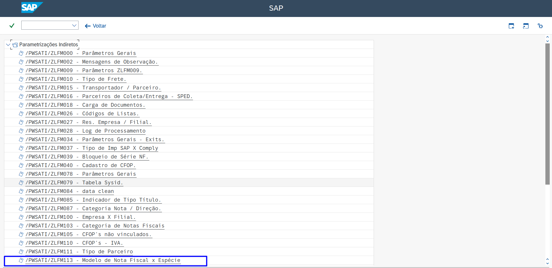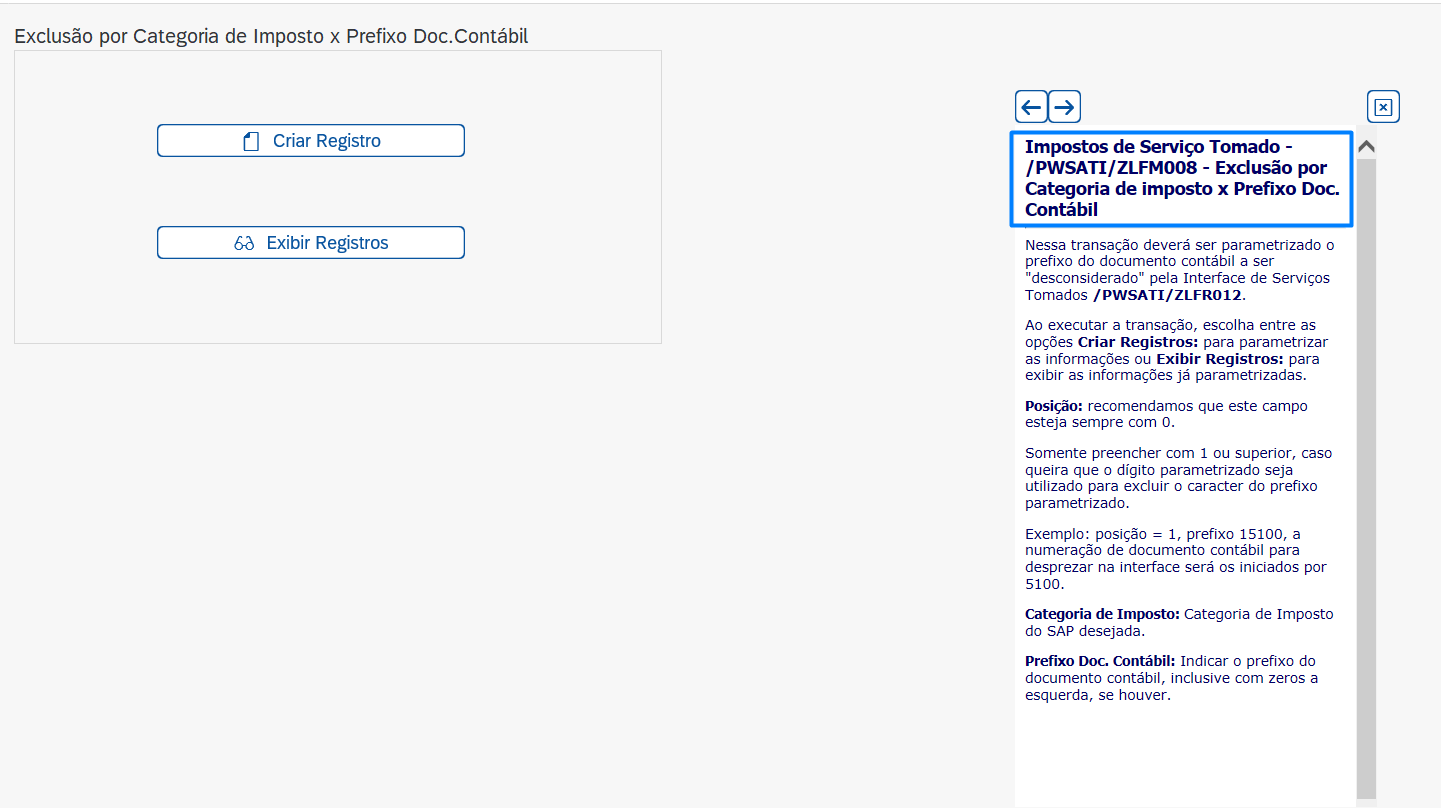 Nessa transação deverá ser parametrizado o prefixo do documento contábil a ser “desconsiderado” pela Interface de Serviços Tomados /PWSATI/ZLFR012.