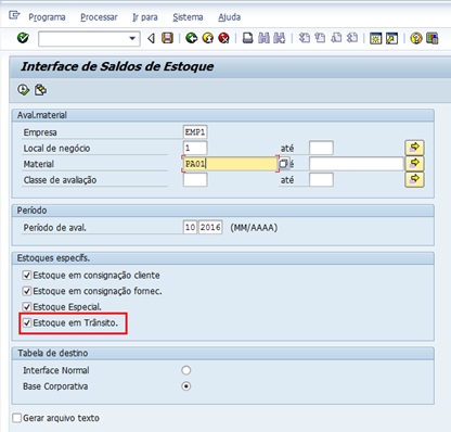 No processamento da Interface de Inventário, /PWSATI/ZLFR007, foi incluída a opção de “Estoque em Trânsito”.
