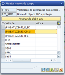 Caso o usuário utilizado para a transferência RFC no ETL já exista no SAP, ele deve ser alterado e o grupo de funções /PWSATI/ZSATI_OP_G deve ser inserido no nome do objeto RFC a proteger como no destaque da figura a seguir:
