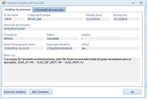 Não será apresentado mensagem de erro na central, sendo que o Status do processo será apresentado como “Cancelado”, será necessário visualizar os detalhes da execução para verificar a pendencia de Guias.