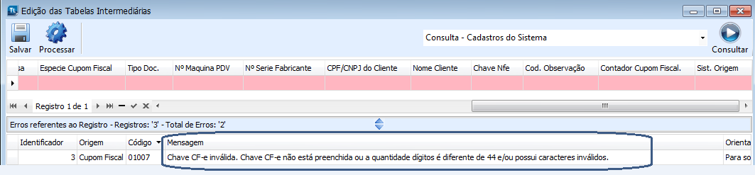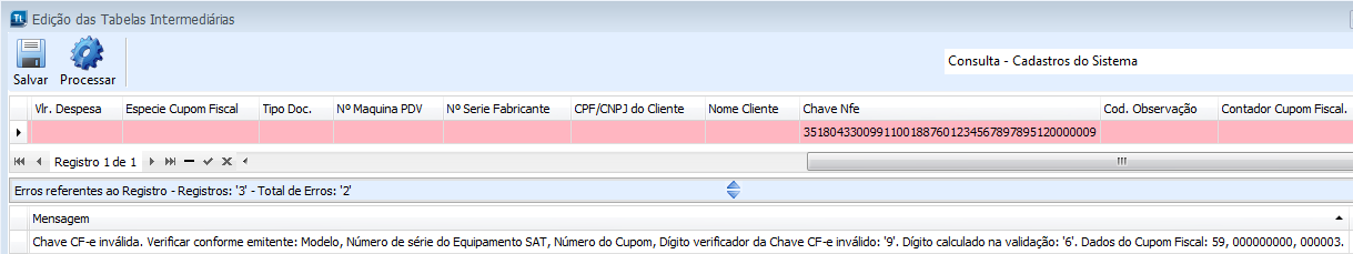 Ao realizar a Integração dos Cupons Fiscais para o sistema, caso haja as inconsistências no campo Chave CF-e conforme citado acima, serão apresentadas as mensagens de erro e não será possível importar o Cupom Fiscal. Somente após a alteração dos dados, o Cupom Fiscal poderá ser importado.