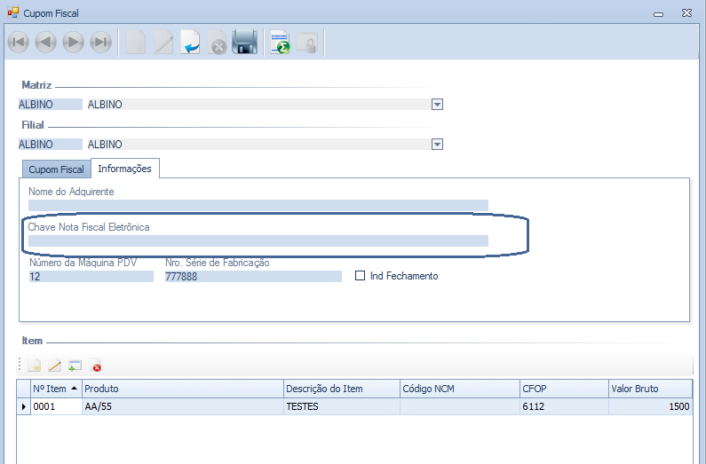 Exemplo de Cupom Fiscal modelo 59 ou 60 com o campo Chave vazio: