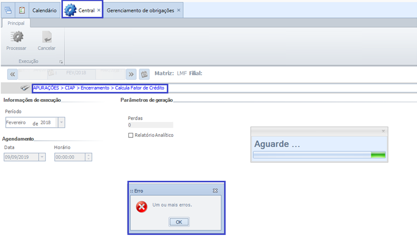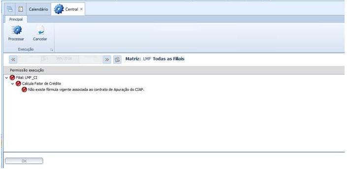 Ao gerar o Encerramento do Cálculo do Fator de Credito > CIAP, utilizando a opção “Todas as Filiais”, quando há alguma filial sem fórmula cadastrada ou a fórmula estava fora do período de vigêcia, era apresentada uma mensagem de erro não tratada.
