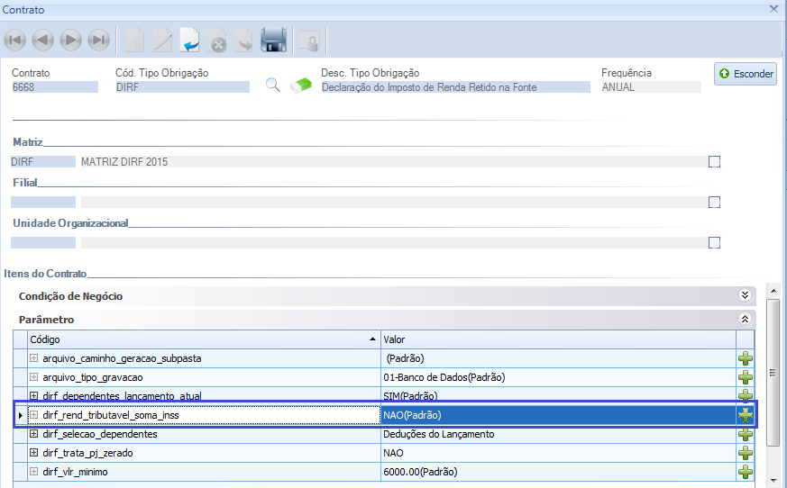 Portanto, foi disponibilizado o parâmetro dirf_rend_tributavel_soma_inss no Itens do Contrato da DIRF.
