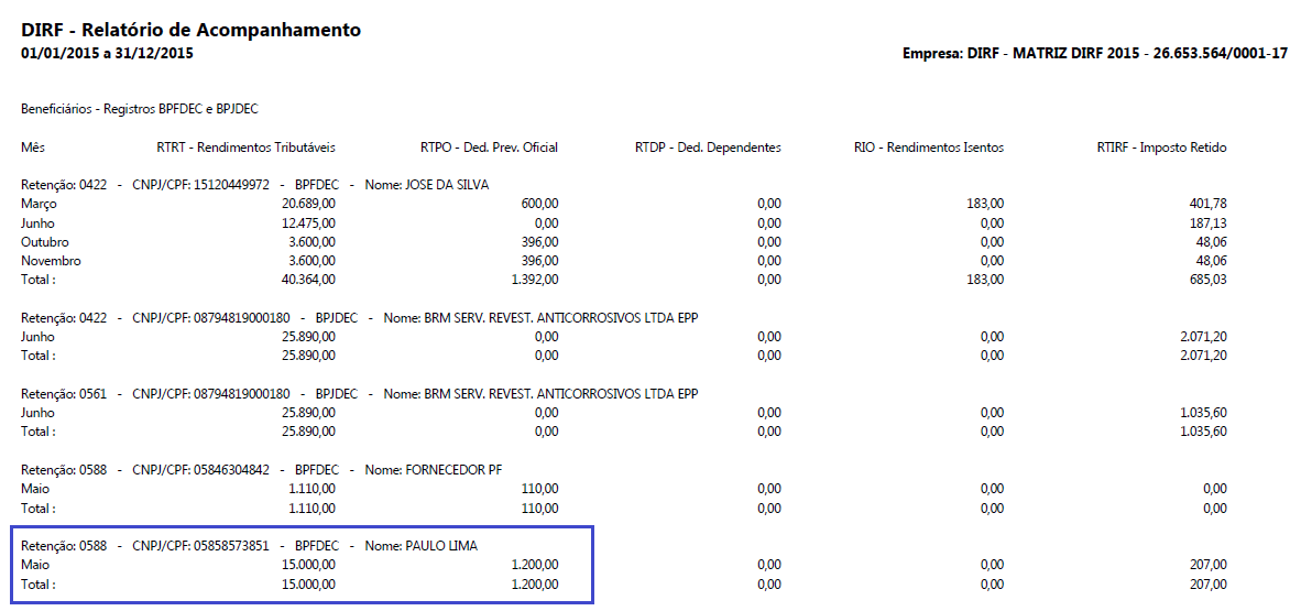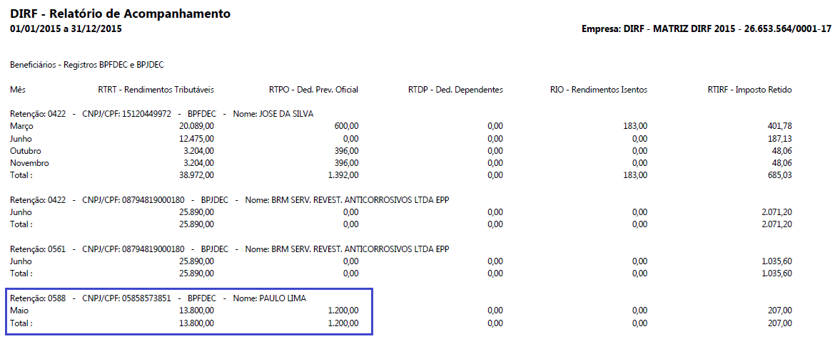 Se o documento estiver com a base de cálculo do IRRF menor que o valor do Rendimento Bruto, o registro RTRT – Rendimentos tributábeis será gerado com o valor indevido. Pois na geração do arquivo magnético da DIRF o sistema considera como Rendimento Tributável a base de cálculo do IRRF.