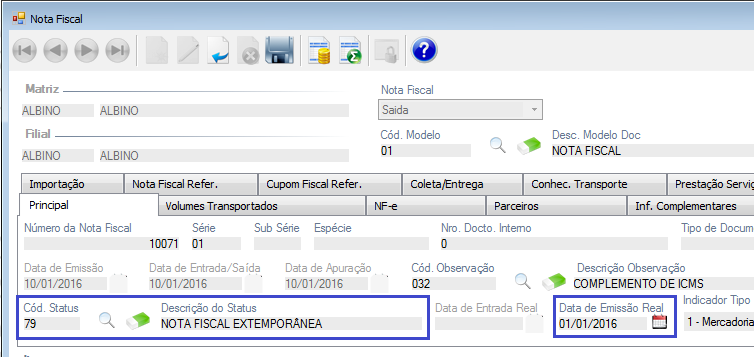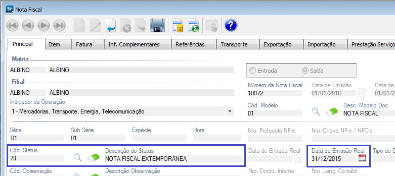 Mensagem: A Data de Emissão Real é obrigatória para a NF Status 79 - Extemporânea de Saída. Data de Emissão Real deve ser menor ou igual à Data de Emissão.