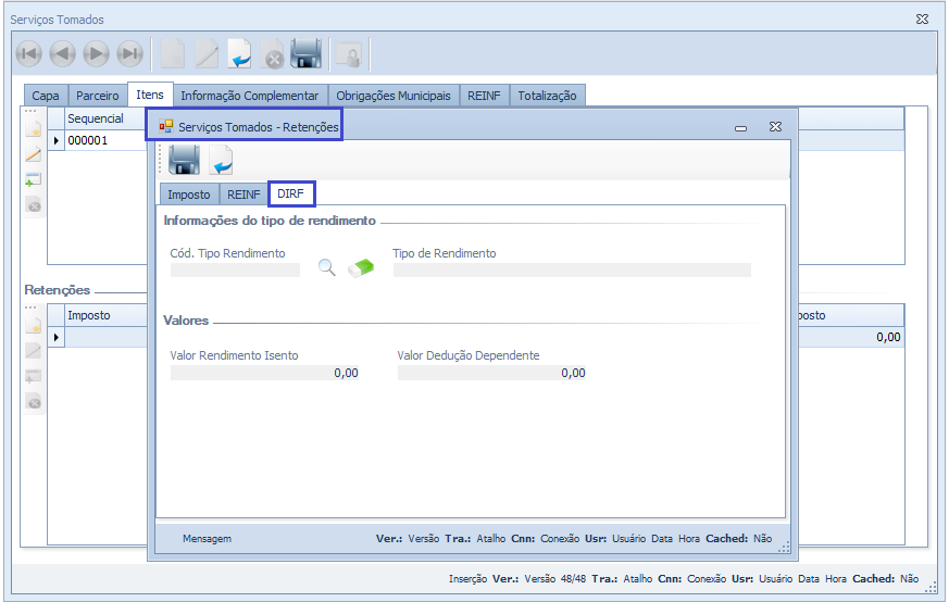 Essas abas são habilitadas na tela "Retenções" ao informar os seguintes impostos: 13 - IRRF, 59 - PIS RETENÇÃO, 60 - COFINS RETENÇÃO, 61 - CSLL RETENÇÃO e 63 - PIS/COFINS/CSLL.