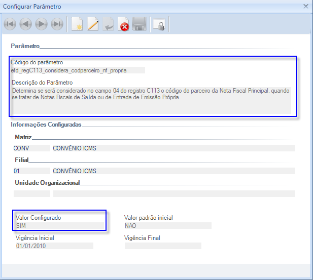 Desta forma, quando este parâmetro estiver configurado com “SIM”, será considerado no campo 04 (COD_PART) do registro C113 o código do parceiro da Nota Fiscal Principal, ao invés de demonstrar o código da filial.