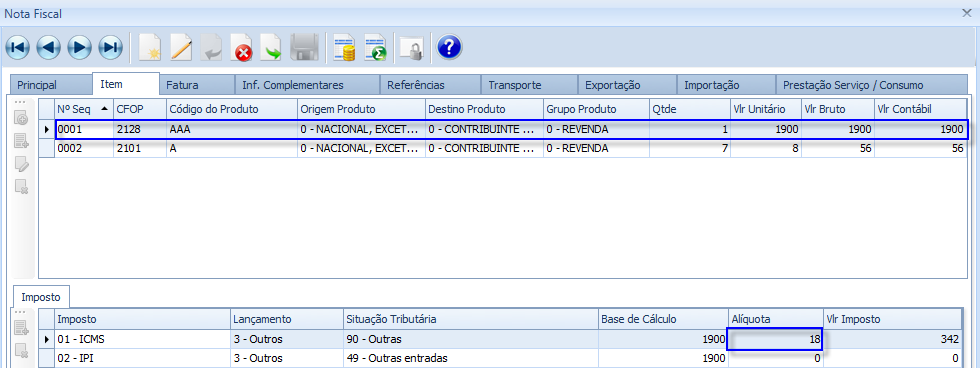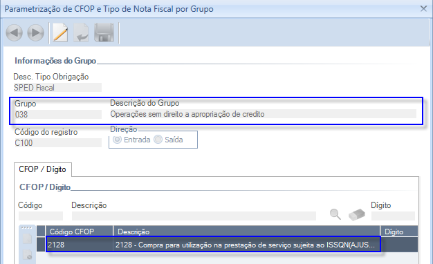 Estas Notas Fiscais serão identificadas através da configuração do CFOP + Dígito no Grupo 038 da tela “Parametrização de CFOP e Tipo de Nota Fiscal por Grupo”.