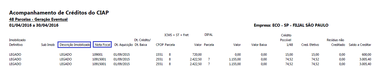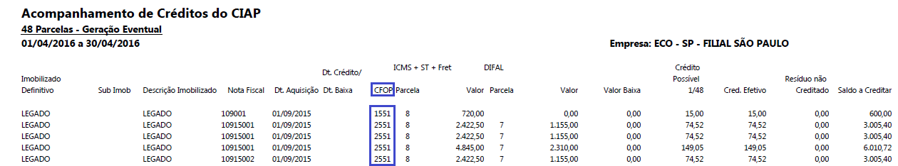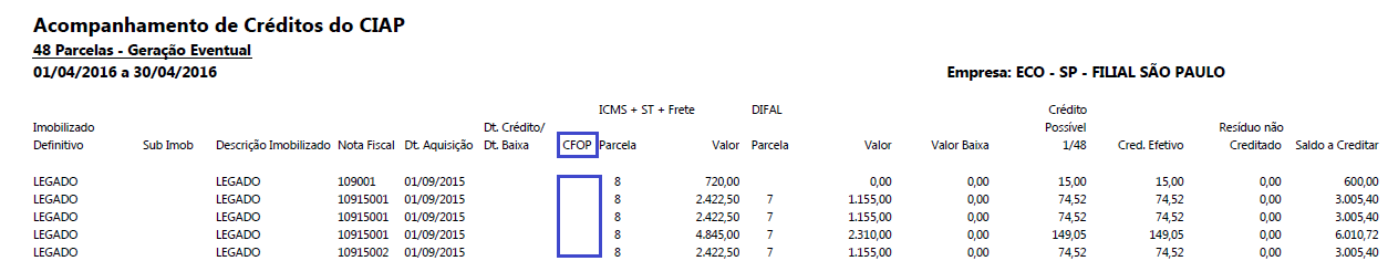 Descrição da Nota: Foram efetuados os seguintes tratamentos no relatório "Acompanhamento de Créditos do CIAP (CTC0001)": 1. Melhoria no layout, com o aumento de espaço entre algumas colunas, em especial, nas colunas "Descrição Imobilizado" e "Nota Fiscal"; 2. Correção para imprimir os CFOP's na coluna CFOP.