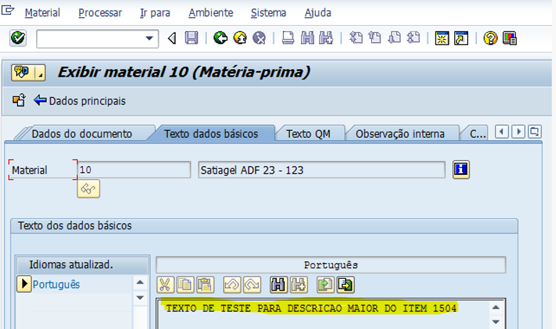 A regra de preenchimento foi alterada devido a concatenação dos dados dos campos de origem, logo nosso programa também irá considerar para seu preenchimento as informações existentes nos dois campos ‘Descrição básica do material’ com 40 caracteres e ‘Texto dos dados básicos (Basic Text 1)’ limitado a 80 caracteres, sendo que para este campo Texto dos dados básico, ainda será considerado o idioma da descrição na seguinte sequência: