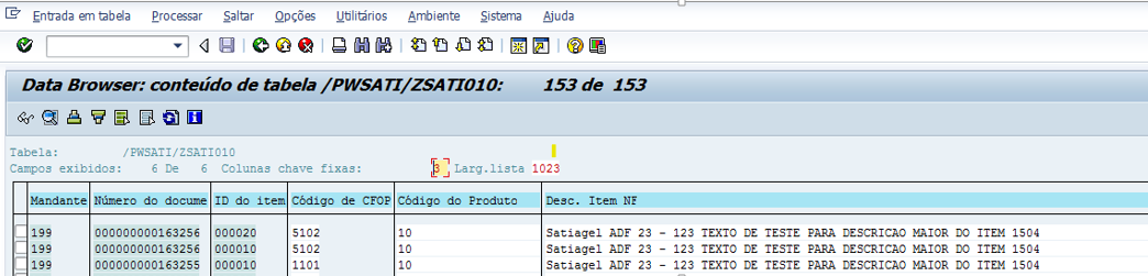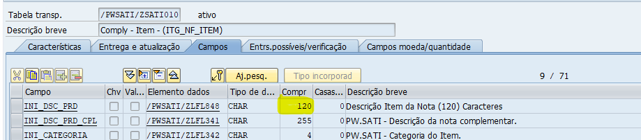 O tamanho do campo Descrição item da nota (campo INI_DSC_PRD) foi alterado de 40 para 120 posições na tabela de Item de notas mercantis de entrada e saída (tabela /PWSATI/ZSATI010).