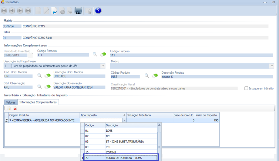 Descrição da Nota: Melhoria na tela de Inventário, com a inclusão do imposto 70 (Fundo de Pobreza - ICMS) no campo Tipo Imposto.