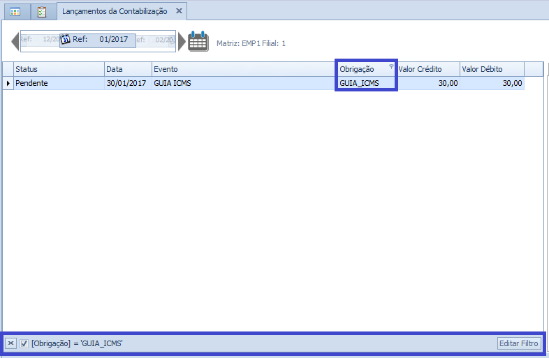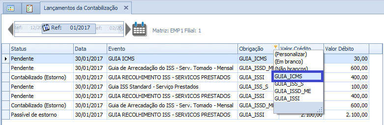 Descrição da Nota: Melhoria na tela de Lançamentos da Contabilização possibilitando o filtros pelos valores das colunas de Evento e Obrigação.