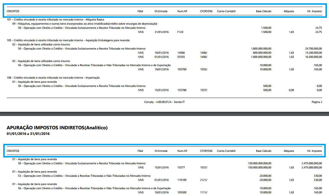 Melhoria efetuada no 'Relatórios Analítico e Sintético – Apuração Impostos Indiretos PIS/COFINS' para demonstração do cabeçalho nas páginas seguintes.