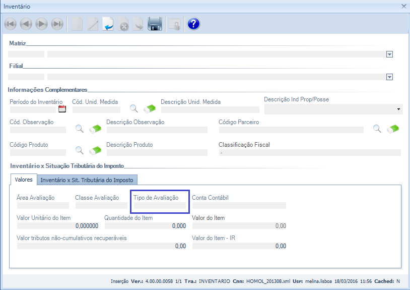 Criação do campo Tipo de Avaliação, inclusão na tela e na Chave de Negócio da Tabela de Inventário.