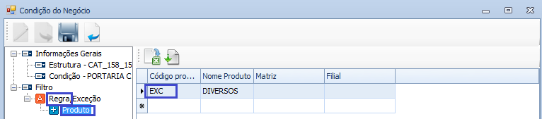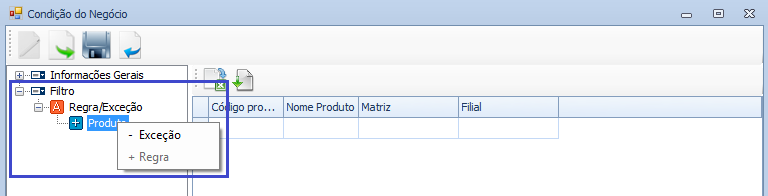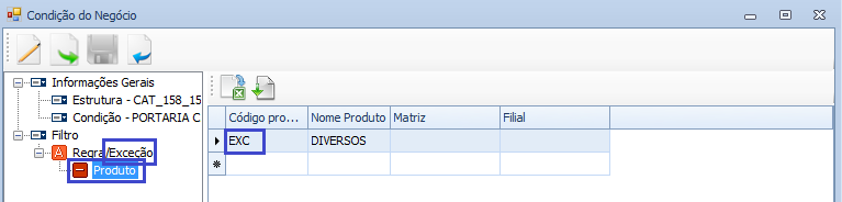 O filtro “Produto” desta estrutura poderá ser utilizado como regra ou exceção. Tem como padrão a utilização como “Regra”: