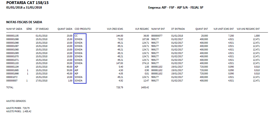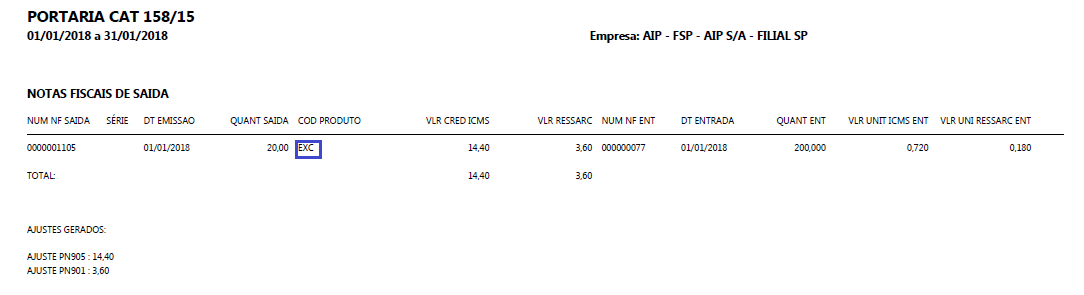 Somente o produto “EXC” foi considerado na apuração do ressarcimento: