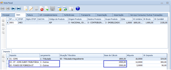 Para efetuar a soma do imposto principal ao FECP, os Tipos de Lançamento e Base de Cálculo de ambos os impostos devem ser iguais.