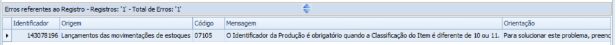No Log de Validação da Interface com o código 07105 'O identificador da Produção é obrigatório quando a Classificação do Item é diferente de 10 e 11', não ficava claro para o usuário o que era o erro, para realizar o ajuste.