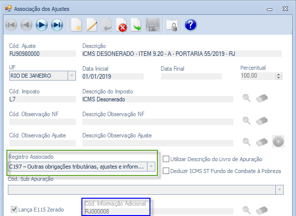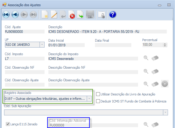 Tratamento realizado no registro E115 gerado com 0 (zero) no campo 03 (VL_INF_ADIC) para atender ao item 9.16 da Portaria 55/2019 - RJ, quando houver configuração do mesmo Cód. Informação Adicional na tela "Associação dos Ajustes" para registros diferentes: C197 e D197.