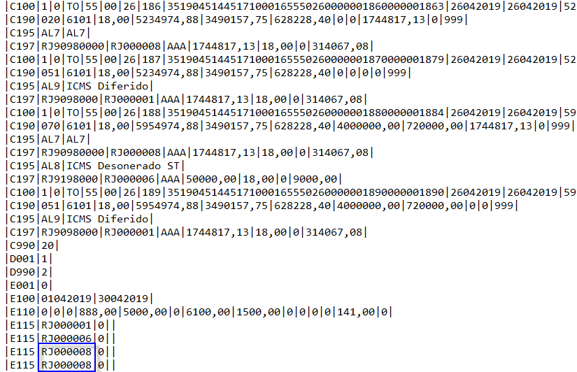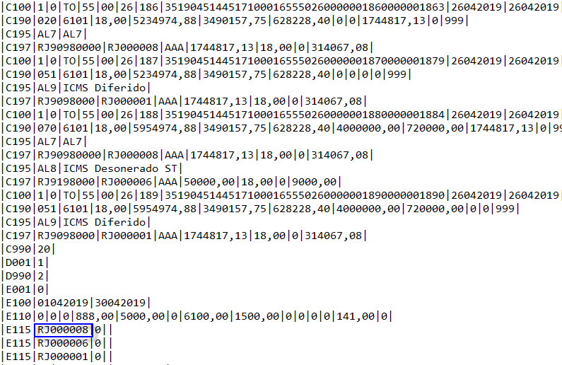 Descrição da Nota: Tratamento realizado no registro E115 gerado com 0 (zero) no campo 03 (VL_INF_ADIC) para atender ao item 9.16 da Portaria 55/2019 - RJ, quando houver configuração do mesmo Cód. Informação Adicional na tela "Associação dos Ajustes" para registros diferentes: C197 e D197. Tratada a geração do registro 0000 para que os registros E300 e E310 não sejam duplicados para a UF de Origem.