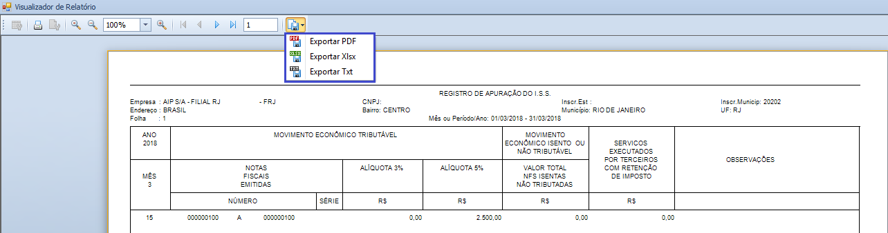 Cód. Matriz / Cód. Filial/Descrição do Livro de ISS e mês/ano de geração.