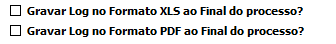 - Através do botão Processar (Avançado) a opção de gravar Log de Erros no final do processo. Será possível selecionar entre os formatos Xls (planilha Excel) ou PDF.