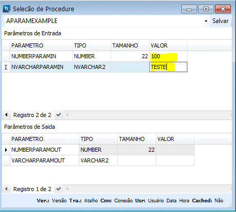 Ao marcar o parâmetro para execução da procedure será exibida uma tela onde será possível visualizar e selecionar as procedures do banco, nesta tela será possível informar parâmetros (Parâmetros de Entrada) para a procedure caso a mesma possua e visualizar os parâmetros de Saída (parâmetro out) caso a procedure possua. Os Parâmetros de Saída podem ser utilizados para retornar informações da execução da procedure para o processo.