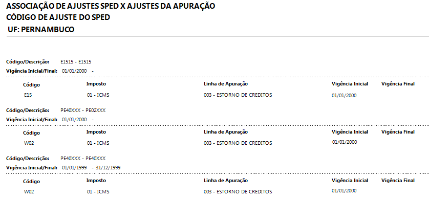 Nesta opção serão listados os Ajustes da Apuração, Descrição e Vigências e abaixo dele todos os Ajustes do SPED que foram associados pela tela Associação dos Ajustes, com as informações: UF, Código SPED, Imposto, Vigências e Registro Associado.