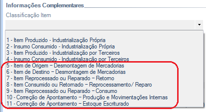 - No campo Classificação Item, foram incluídos os códigos abaixo que serão utilizados para seleção das informações dos registros relacionados: