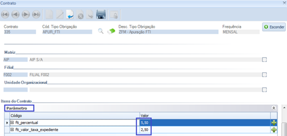 Print do Contrato - aba Parâmetro: