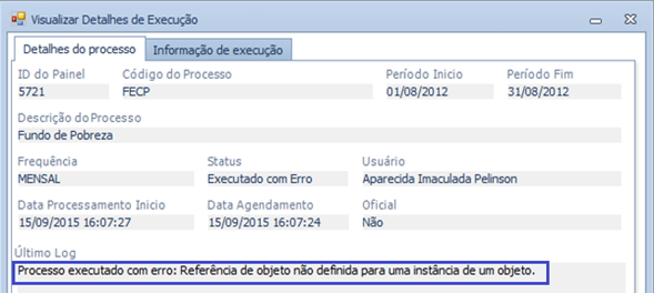 Processo executado com erro: Referência de objeto não definida para uma instância de um objeto.