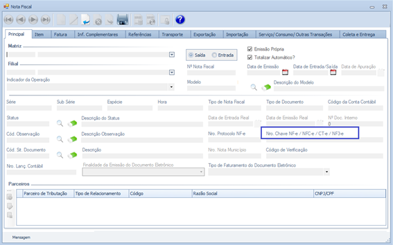 Descrição da Nota: Tratamento realizado na tela "Nota Fiscal", para não excluir a informação do campo Tipo de lançamento. Alteração na descrição do campo Nro. Chave NF-e / NFC-e / CT-e / NF3-e para Nro. Chave NF-e e habilitado o campo para modelo 62, em atendimento a Nota Técnica N.T. 2022.001 - v.1.1, da Versão 3.1.0 do Guia Prático da EFD ICMS IPI e com vigência inicial em 01/2023 - Leiaute_Versão_017.