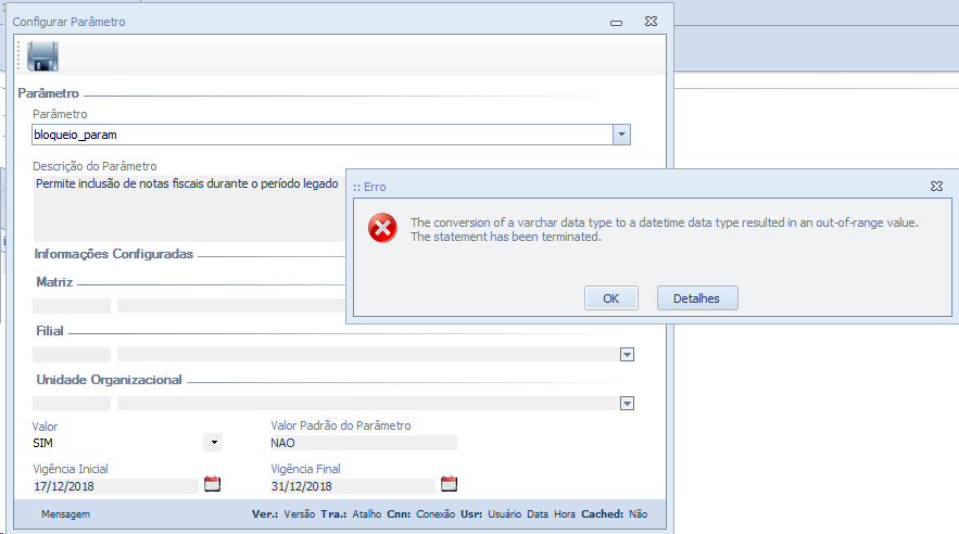Ao tentar gravar/atualizar a configuração do parametros, ocorre o erro abaixo :