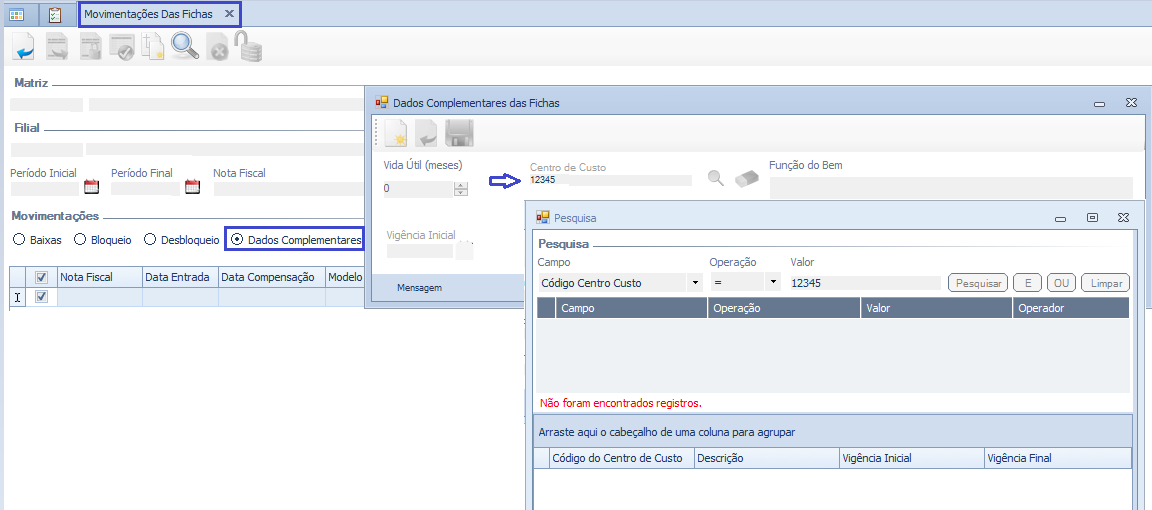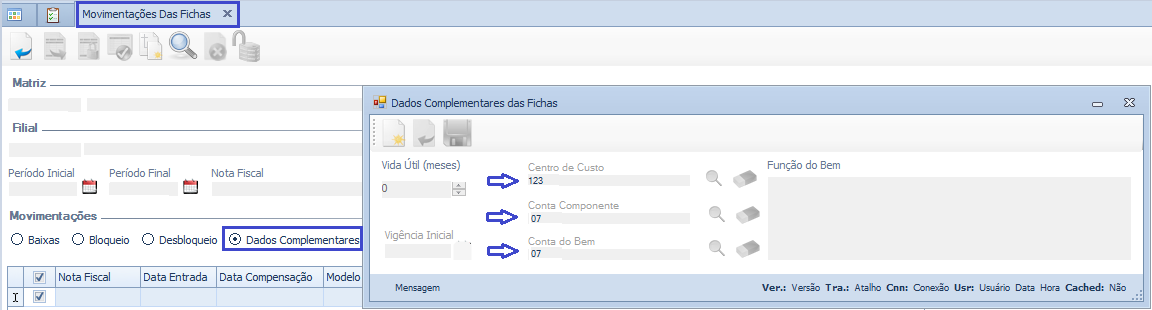 Foi realizada melhoria na tela de Movimentações das Fichas, permitindo a digitação dos componentes, Centro de Custo, Conta Componente, Conta do Bem em Dados Complementares.