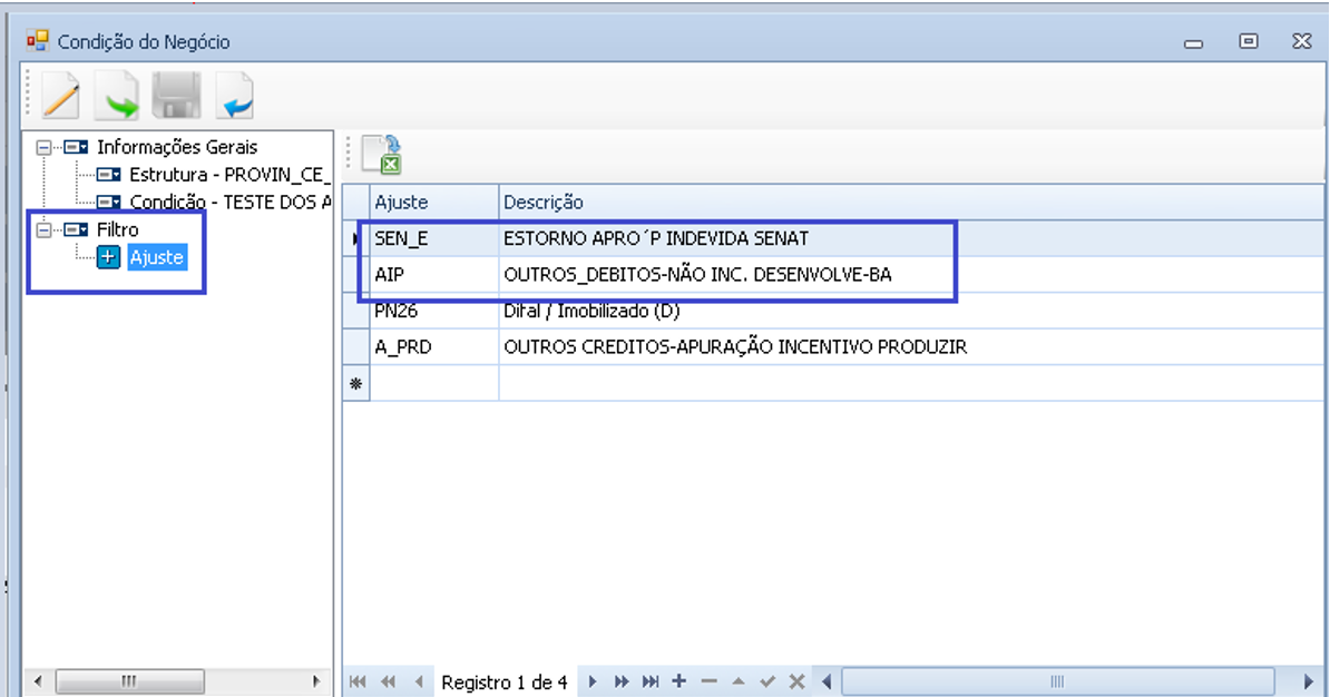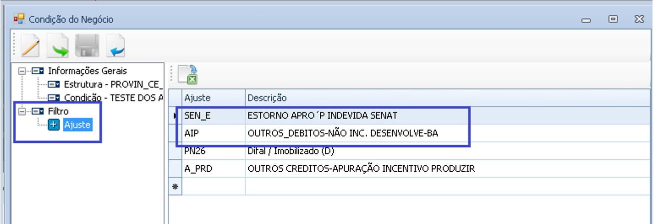 Para que os valores dos ajustes manuais não transitem na apuração deverá ser parametrizada uma condição de negócios com os ajustes que não deverão ser apresentados na Apuração Incentivada PROVIN/CE.